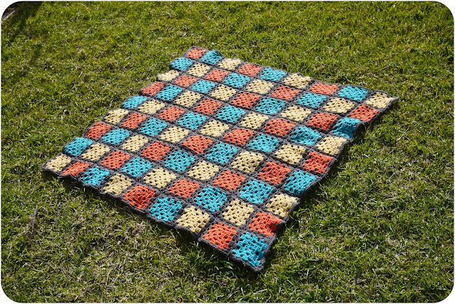 It probably took 3 months of crocheting the granny squares (on the bus, watching Boardwalk Empire) and another month of edging them with the charcoal wool, and then joining... I love thinking that granny square blankets will be quick, but they never are for me! (Just found this post in May, saying I'm finishing it up)